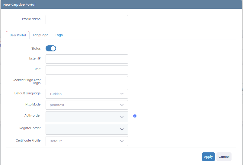 | Listen IP                 | Captive Portal'ın hangi IP adresinde çalışacağı belirlenmelidir.                                                                                                                                            |