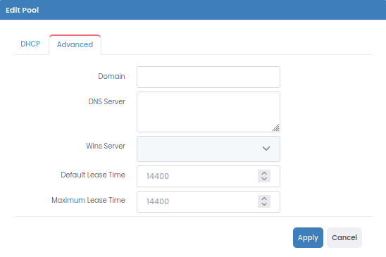 DHCP Sunucusuna istekte bulunacak cihazlara sağlanacak IP adresi, DNS, Gateway vb. bilgileri içeren Pool konfigürasyonu için bu sekmedeki *<mark style="color:blue;">**New Pool**</mark>* butonu kullanılabilir.