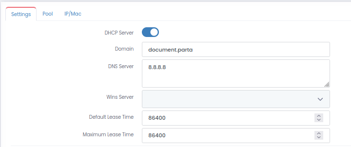 *<mark style="color:blue;">**Configuration -> Network -> DHCP**</mark>* web arayüzünden gerekli konfigürasyonları gerçekleştirebilirsiniz. Bu arayüzde Settings, Pool ve IP/Mac olmak üzere 3 adet sekme bulunmaktadır.