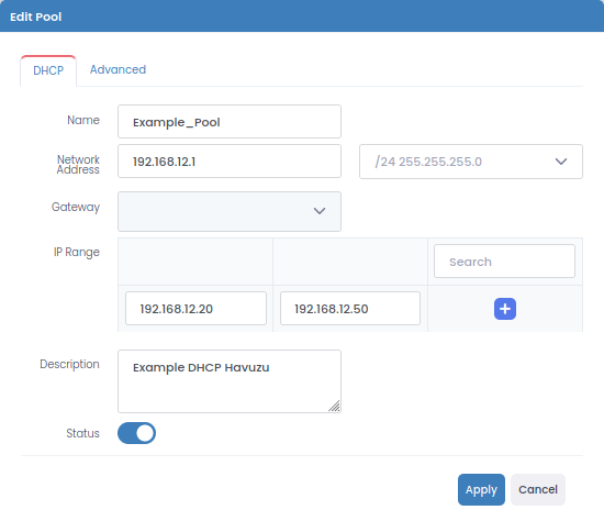 | Status          | DHCP Pool'un çalışabilmesi için aktifleştirilmesi gereklidir.                                                                                                       |