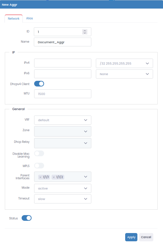 | Status               | Aggr Interface'nin aktif çalışabilmesi isteniyorsa seçilmesi gereklidir.                                                                                     |