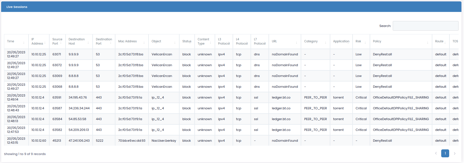 1- Bir NAC kullanıcısına ait DPI filtrelemesi sonuçları: