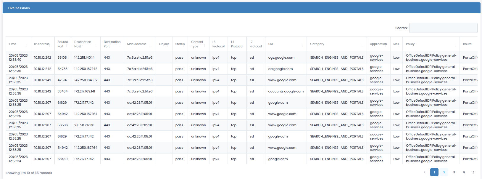 *<mark style="color:blue;">**Diagnosis -> Traffic -> Live Sessions -> Network**</mark>* sekmesinde anlık olarak Targitas üzerinden geçen trafik için gerçekleştirilen Firewall değerlendirmeleri analiz edilebilir. Filtreleme parametreleri kullanılarak istenilen şartları sağlayan Firewall değerlendirmelerinin listelenmesi sağlanır.