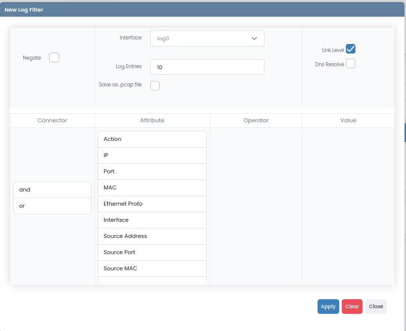 | Interface          | Seçenekler arasından trafiğin izlenmesi istenilen interface seçilmelidir. log0 interface, Firewall değerlendirmesinden geçen trafiğin izlenmesi için kullanılabilir.                                                                                                                                                            |