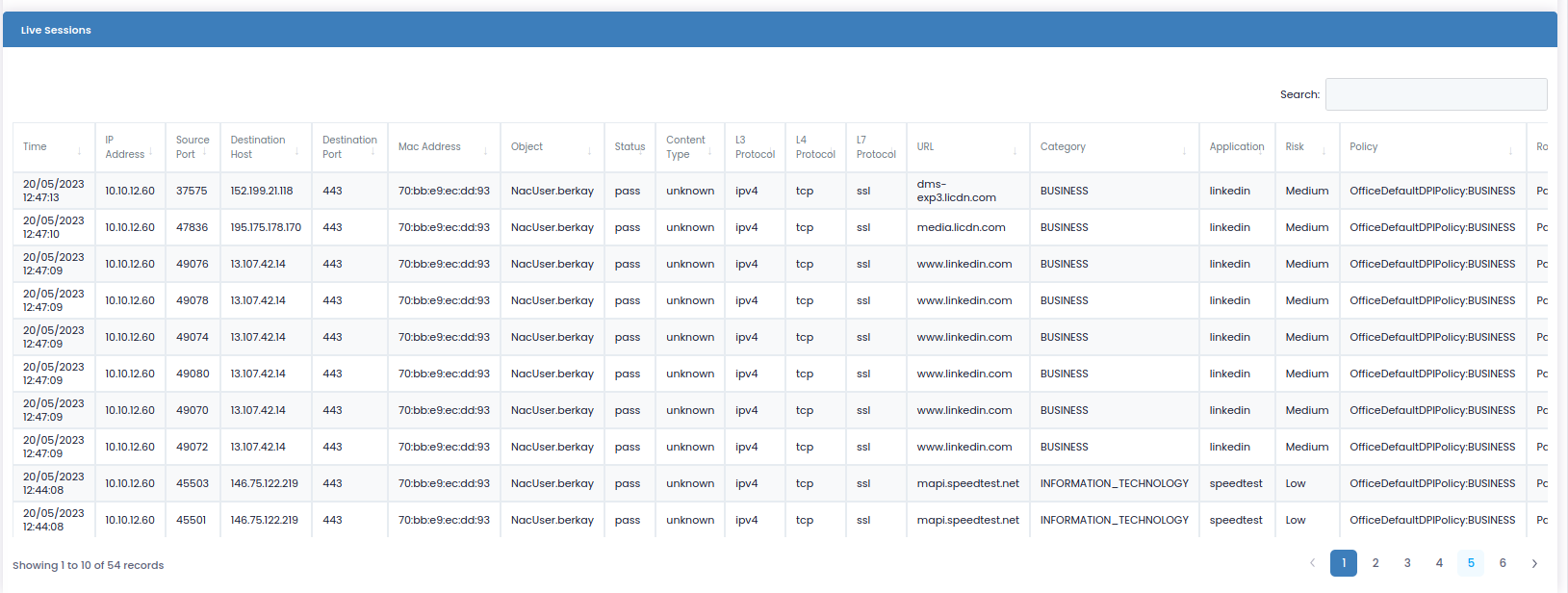 Diagnosis -> Traffic -> Live Sessions -> DPI sekmesinde yaşanılan bir problemin tespiti için yeni gerçekleşen DPI değerlendirmeleri analiz edilebilir. Filtreleme parametreleri kullanılarak istenilen şartları sağlayan DPI değerlendirmelerinin listelenmesi sağlanır.
