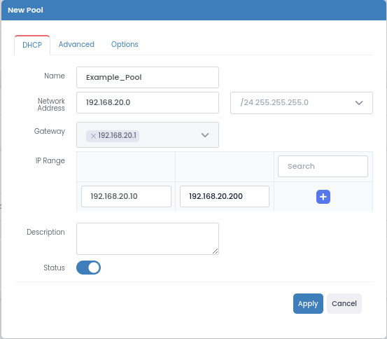 | Status          | DHCP Pool'un çalışabilmesi için aktifleştirilmesi gereklidir.                                                                                                       |