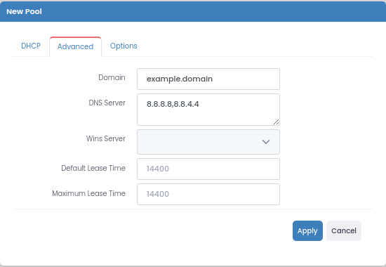 Pool sekmesi, DHCP IP adres havuzunu tanımlamak için kullanılır. Burada, kullanılabilir IP adres aralıkları, ağ maskesi, varsayılan ağ geçidi ve DNS sunucu adresleri gibi parametreler belirlenir.