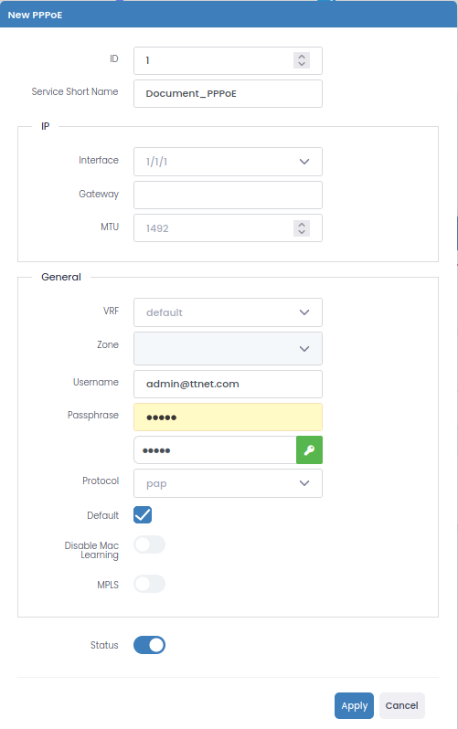 | Status             | PPPoE'nin aktif çalışabilmesi için seçilmesi gereklidir.                                                            |