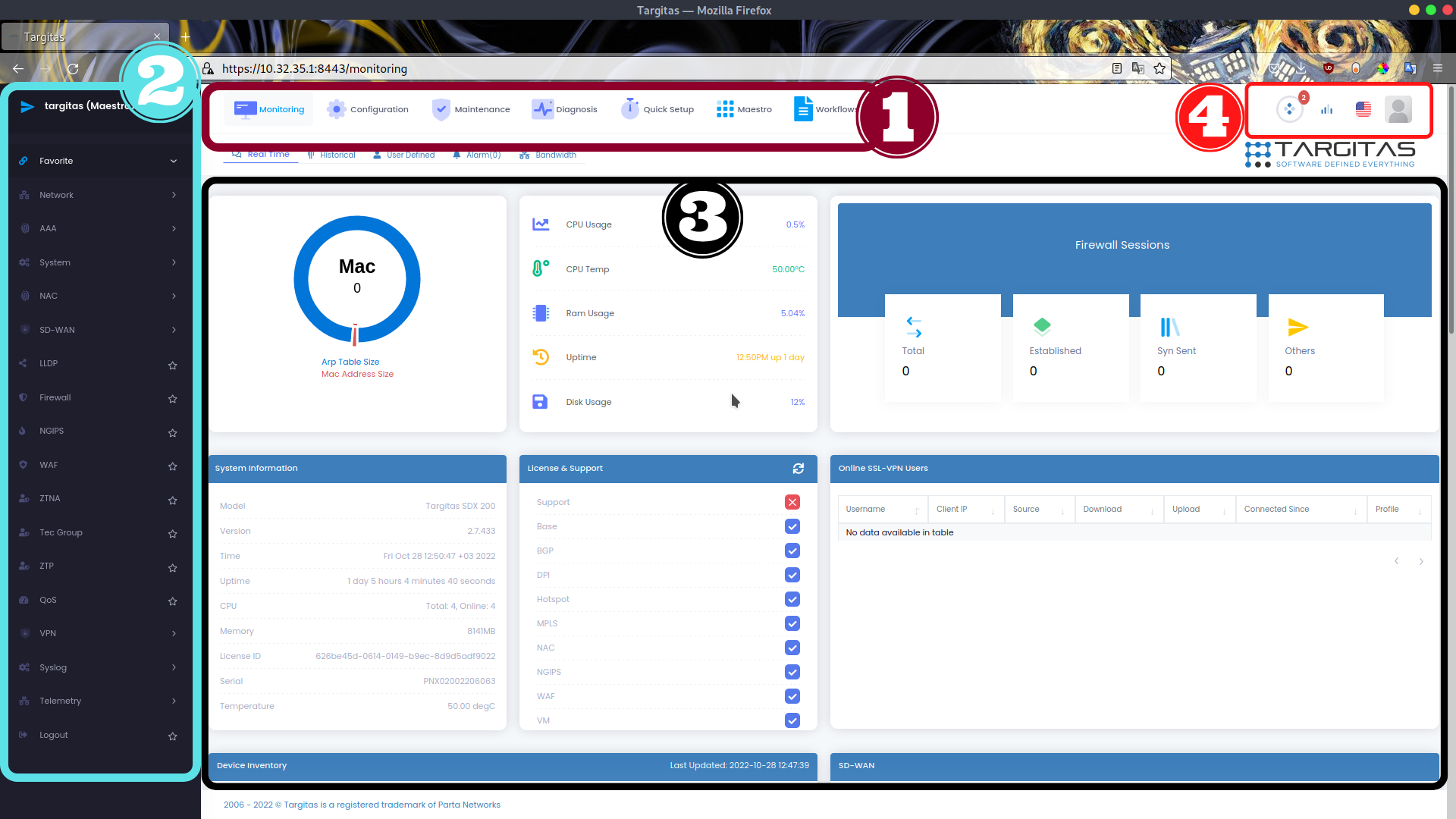 Targitas web arayüzündeki sayfalar aşağıdaki görseldeki gibi 4 bölüme ayrılabilir.